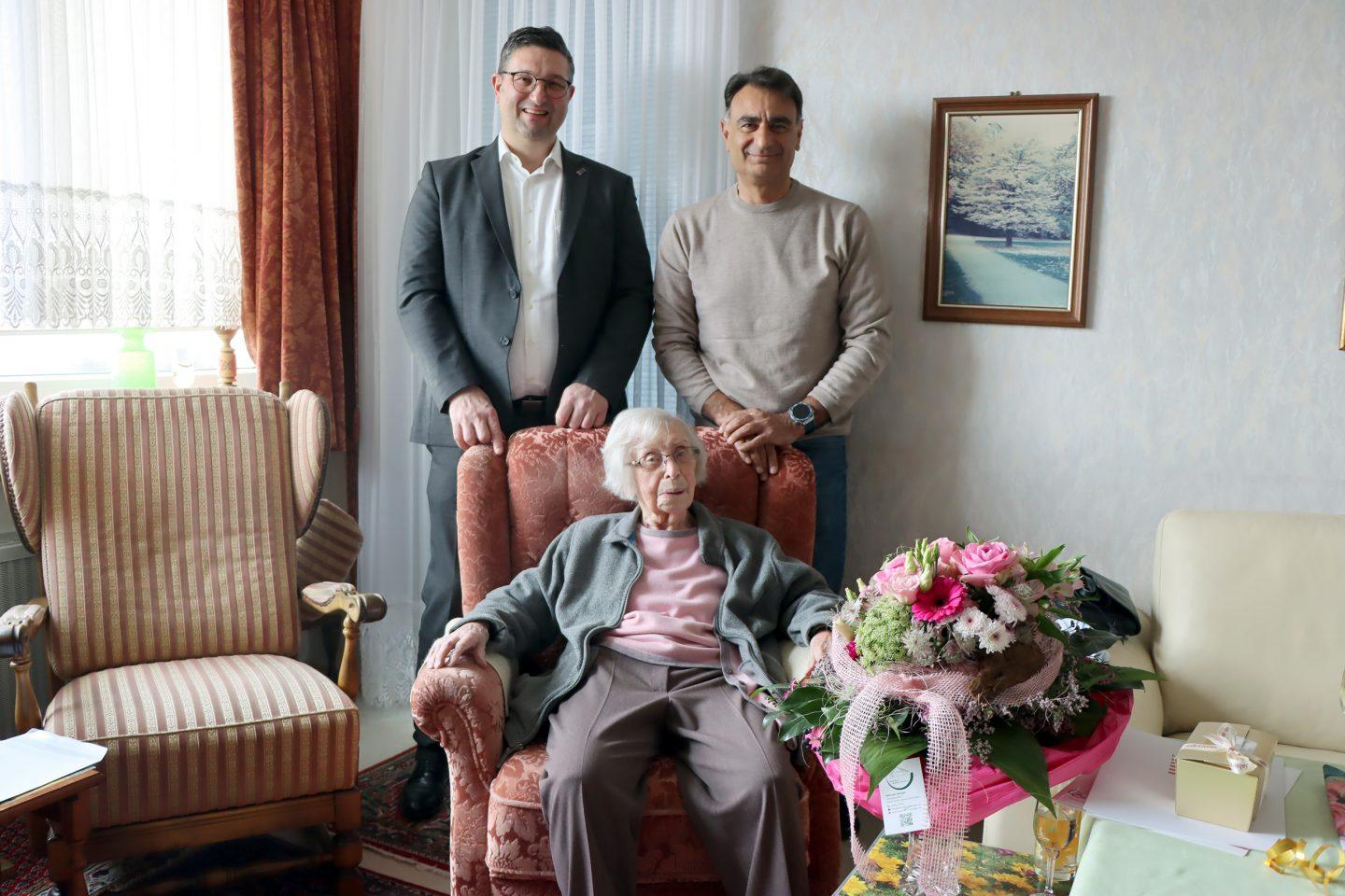 Bitragsbild: Blumen und Pralinen für die Jubilarin: Der Erste Kreisbeigeordnete Adil Oyan und Groß-Geraus Bürgermeister Jörg Rüddenklau gratulieren Helene Elisabeth Obenauer zum 105. Geburtstag.