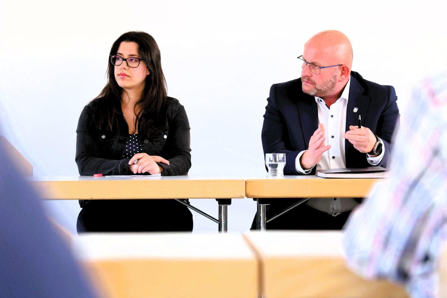 Featured image: Mayor Marcus Kretschmann with Giulia Reinhardt from the Citizens' Service Center at a public meeting in Goddelau. Photo: City of Riedstadt