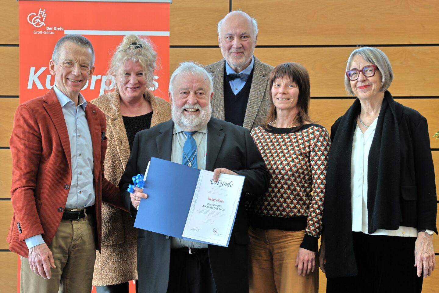 Featured image: Radiant award winner: Walter Ullrich (center) is the recipient of the 2025 Culture Prize of the Groß-Gerau district. The picture shows (from left): District Administrator Thomas Will, Heike Karcher (jury member), Walter Ullrich, presenter Prof. Wolfgang Schneider, Claudia Weller (jury member), and Gabriele Fladung (jury member). Photo: District Administration