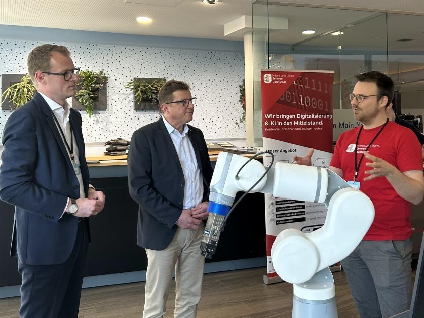 Featured image: Robert Lippmann (left), CEO of the Chamber of Industry and Commerce, and State Secretary Stefan Sauer (center) during the demonstration of a technical demonstrator. Photo: Mittelstand-Digital Zentrum Darmstadt