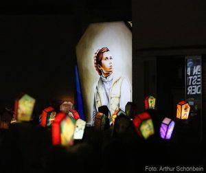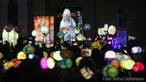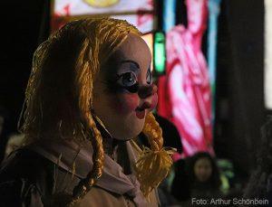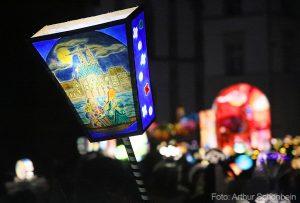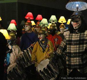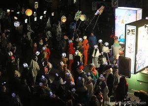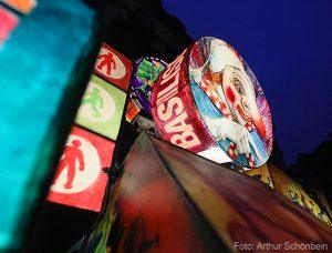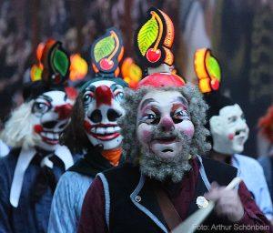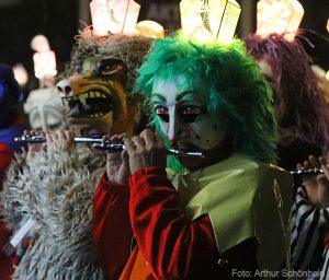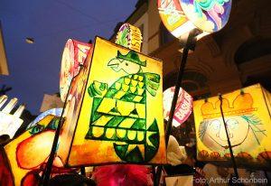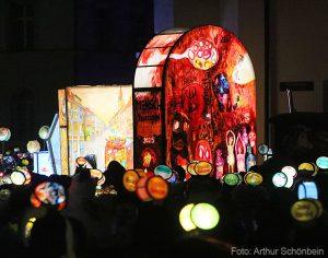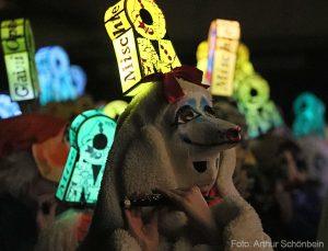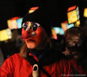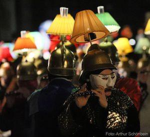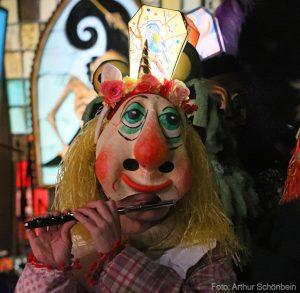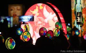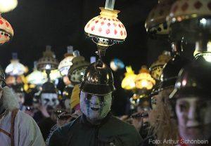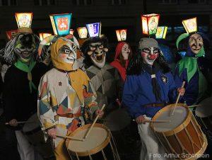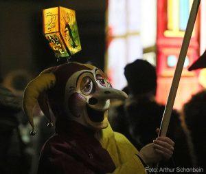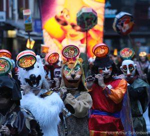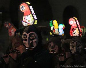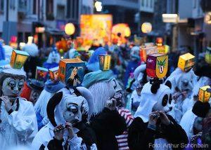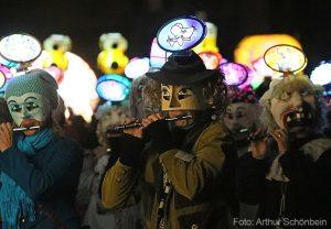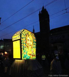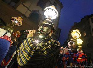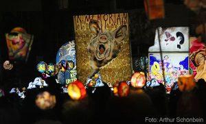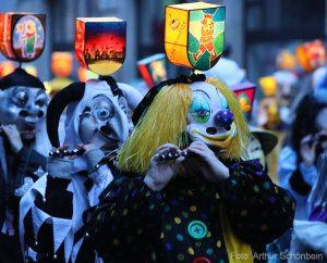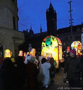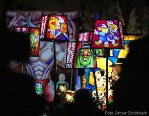 Only the artistically painted lanterns of the carnival people donate light. These are worn or pulled through the streets on cars. Each lantern tells a story, often with biting humor or political satire - typical of the Basel carnival.