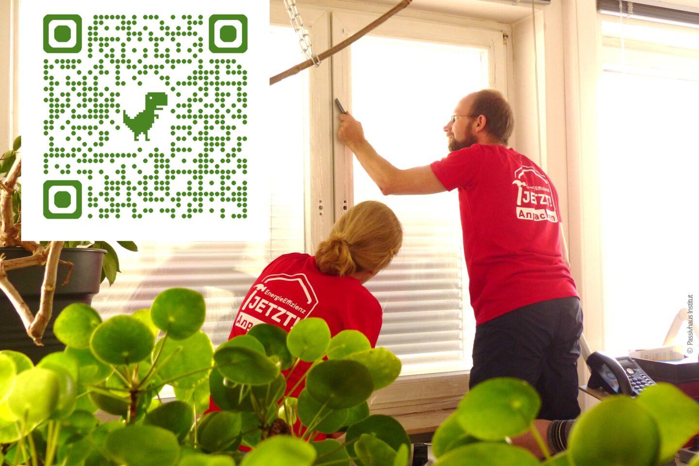 Beitragsbild: Auch die Verbesserung von Fenstern mit einer Folie gehört zu den vorgestellten Maßnahmen. Der QR-Code führt zur Website klimafreundliches-riedstadt.de Foto: Passivhaus Institut