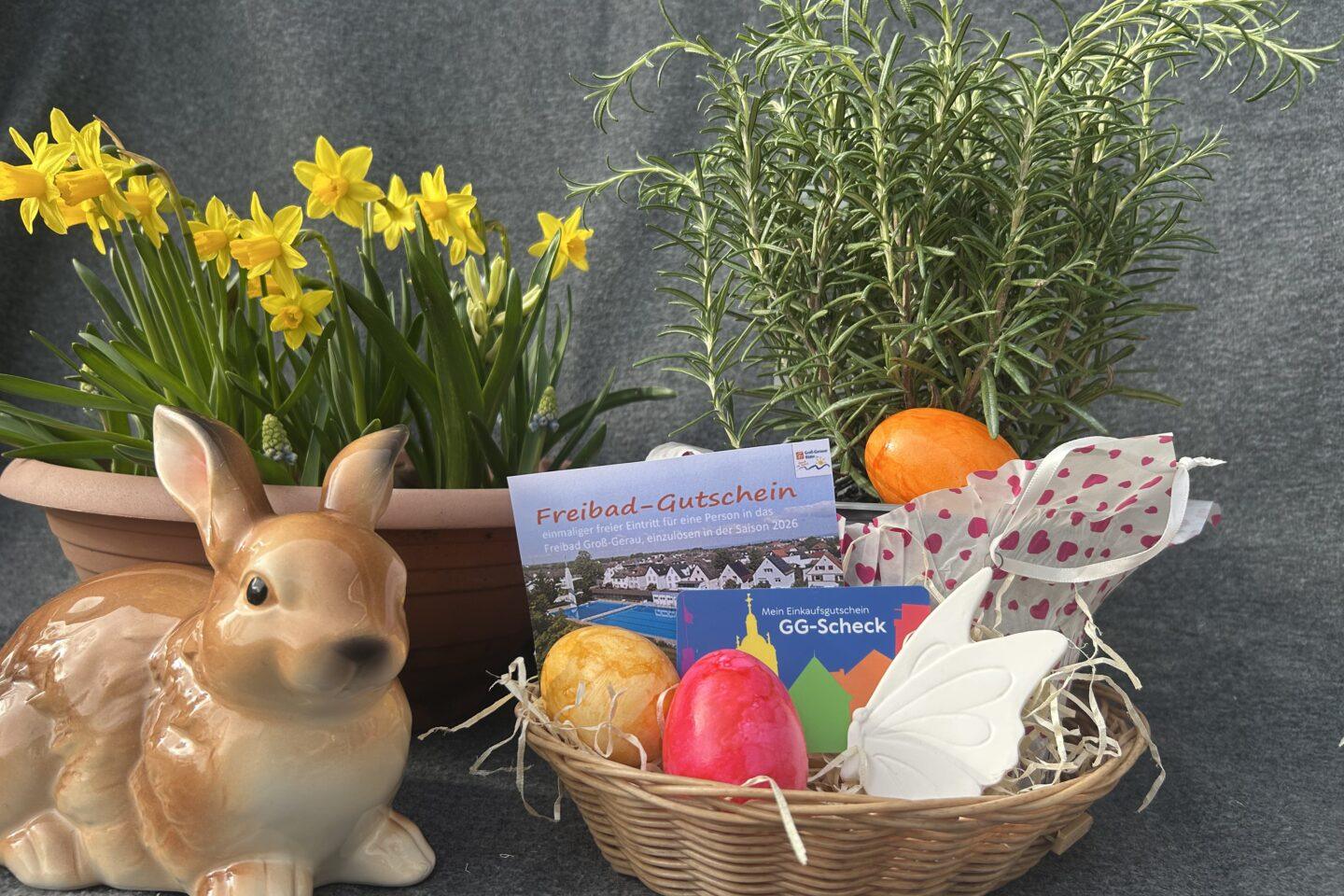 La caja contiene artículos como huevos de Pascua de colores, un dulce, romero fresco, una mariposa de porcelana, una entrada gratuita a la piscina exterior de Groß-Gerau y el GG-Scheck . La caja decorativa también se puede reutilizar.
