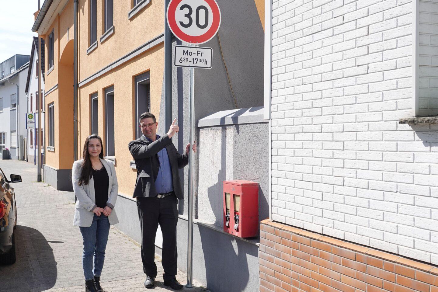 Imagen destacada: ¡Hecho!: Ya está en vigor el límite de velocidad de 30 km/h en la calle Rheinstraße de Dornheim, al menos de lunes a viernes, de 6:30 a 17:30. El alcalde de Groß-Gerau, Jörg Rüddenklau (derecha), y Tahmina Salloum, subdirectora de la Oficina de Asuntos Ciudadanos y Orden Público, se muestran satisfechos con el éxito. Foto: Ayuntamiento de Groß-Gerau/Jörg Monzheimer