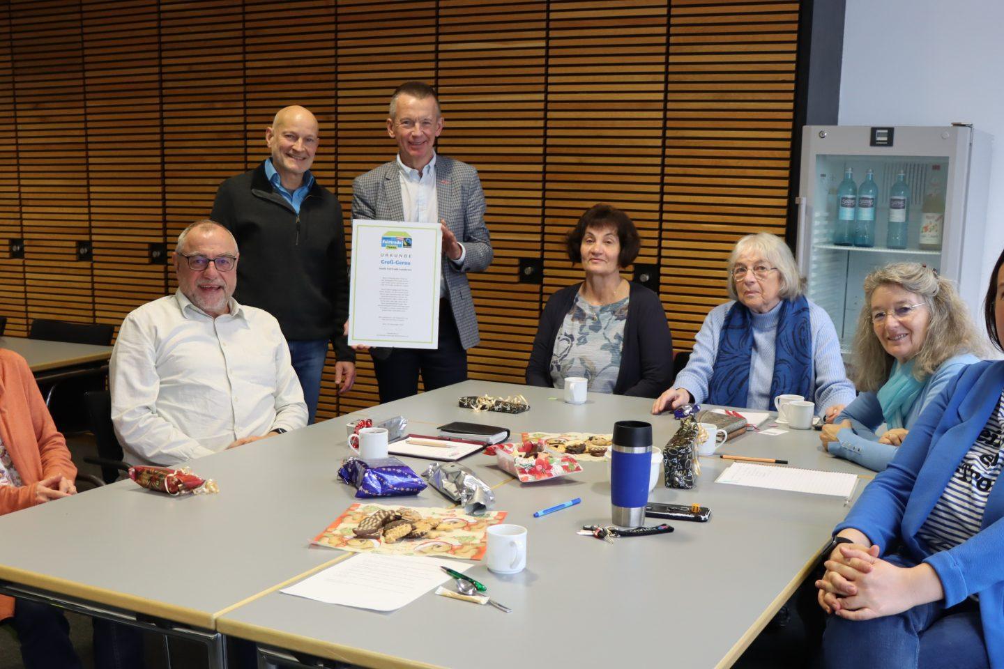 Beitragsbild: Bei der vergangenen Sitzung der Steuerungsgruppe waren dabei (sitzend von links) Claudia Weller (für die Steuerungsgruppe Büttelborn), Wolfgang Bleith (für die Steuerungsgruppe Bischofsheim), Barbara Reis (1. Vorsitzende Partnerschaft Eine Welt – Dornheim 1980 e. V., Betreiber des Weltladens Dornheim), Else Trumpold (Vorsitzende Kirchenvorstand Evangelische Kirchengemeinde Büttelborn), Karin Wehner (Fairtrade-Beauftragte Bischofsheim), Marta Wachowiak (Fachdienstleitung Klimaschutz Kreis GG), stehend links Stefan Leimbach (Fairtrade-Beauftragter des Kreises Groß-Gerau) und Landrat Thomas Will mit der Urkunde zur Titelerneuerung. Foto: Kreisverwaltung