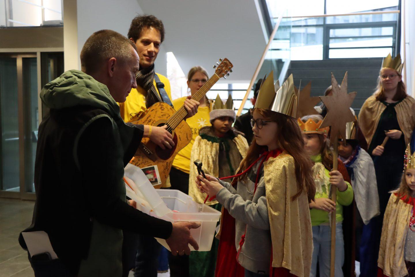 L'administrateur de district, Thomas Will, a remercié le groupe pour son engagement, a renouvelé la bénédiction traditionnelle au-dessus d'une porte du bureau de district, a fait un don d'argent et a lancé un appel important aux enfants : faire attention aux produits sans travail des enfants – par exemple, les vêtements ou les jouets.
