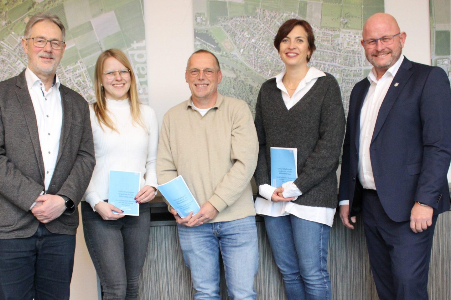 Beitragsbild: Bürgermeister Thomas Raschel und die Hauptamts- und Personalamtsleitungen Jaqueline Wempel und Manuel Christanz aus Stockstadt mit Jennifer Muth und Bürgermeister Marcus Kretschmann aus Riedstadt mit den Broschüren über Gesundheitssportangebote. Foto: Stadt Riedstadt
