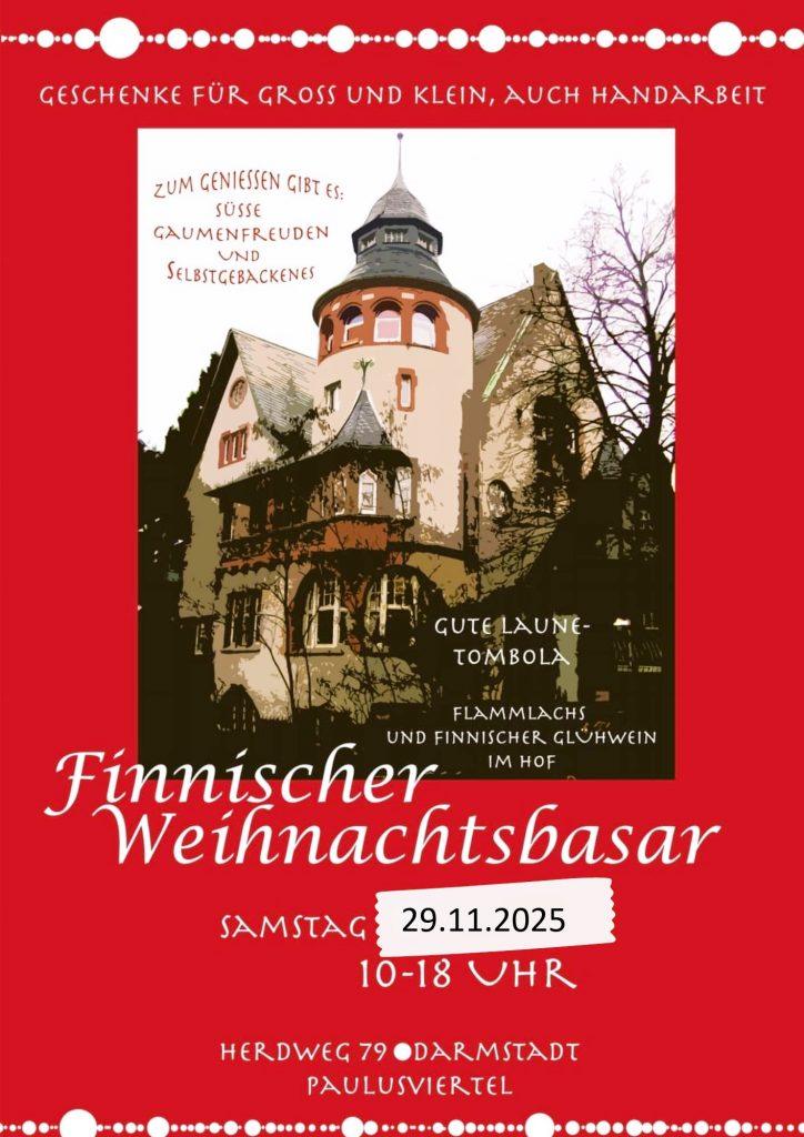 Fińskie Stowarzyszenie Szkolne Frankfurt am Main e.V. na tradycyjny fiński jarmark bożonarodzeniowy w sobotę 29 listopada 2025 roku do secesyjnej willi Niemców bałtyckich, Villa „Pillenburg” w dzielnicy Paulusviertel (Herdweg 79, Darmstadt). W godzinach 10:00-18:00 odwiedzający będą mogli podziwiać nordyckie rękodzieło, kulinarne specjały i poczuć świąteczną atmosferę.