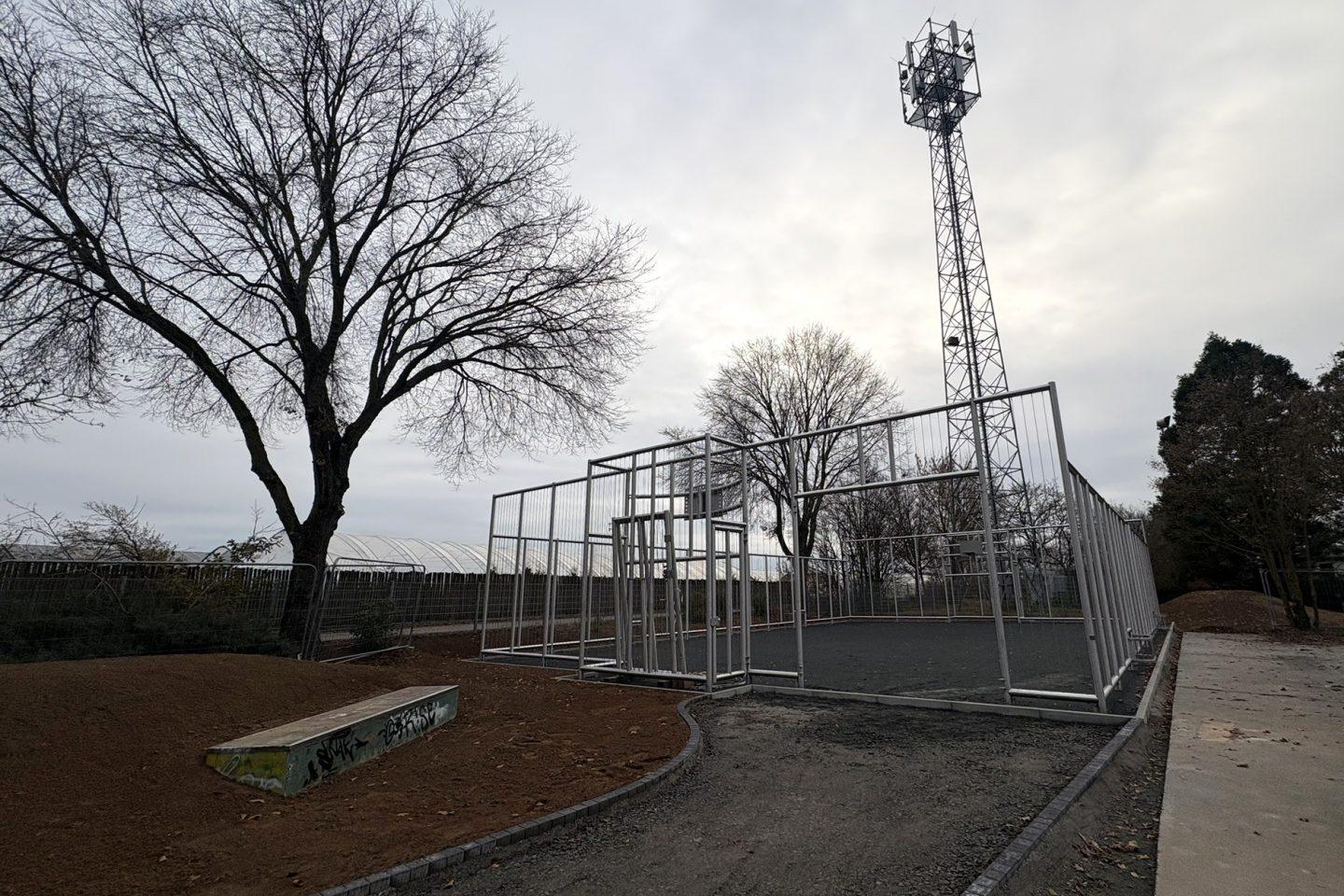 Zdjęcie główne: „ Plac budowy – wstęp wzbroniony!” – tak brzmi aktualny znak informujący o skateparku w południowej części rekreacyjnej. Za zamkniętą bramą stoi ukończona klatka ze stali nierdzewnej elementami naciągniętych jest wyraźnie widoczna. Ta specjalna konstrukcja tworzy tzw. „ cichą klatkę ”, która znacznie redukuje hałas gry piłką. Obiekt doskonale wkomponowuje się w teren rekreacyjny. Zdjęcie: Miasto Griesheim
