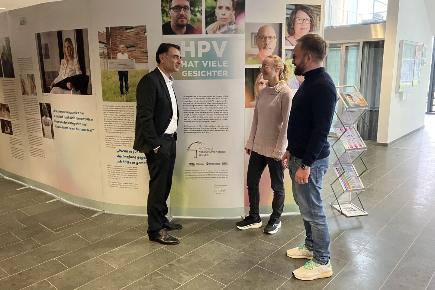 Zdjęcie główne: Pierwszy zastępca starosty powiatu Adil Oyan (po lewej) promuje profilaktykę i zaprasza zwiedzających na wystawę poświęconą wirusom HPV. Dominik Beaunée i Katharina Helbig (w środku) z Wydziału Sprawozdawczości Zdrowotnej i Profilaktyki Powiatowego Urzędu Zdrowia Groß-Gerau są obecni na wystawie i podkreślają ważną działalność edukacyjną i profilaktyczną powiatu. Zdjęcie: Administracja Powiatu