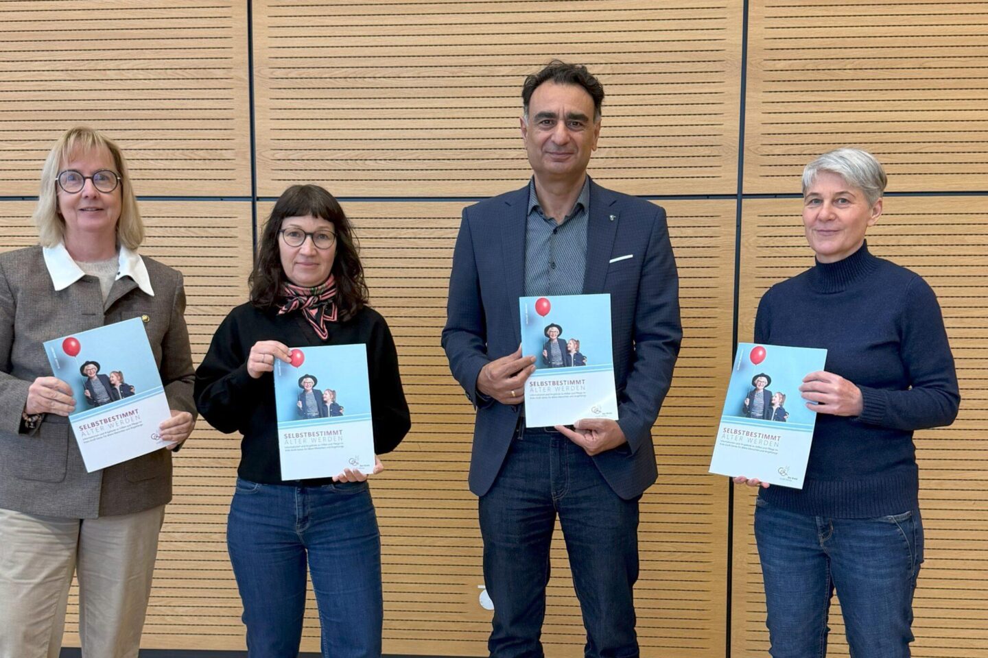 Beitragsbild: Die Neuauflage der Broschüre „Selbstbestimmt älter werden“ präsentierten im Landratsamt der Erste Kreisbeigeordnete Adil Oyan sowie (von links) Karla Schaffner, Sybille Bernard und Corinna Koban vom Fachdienst Sozialplanung der Kreisverwaltung. Foto: Kreisverwaltung