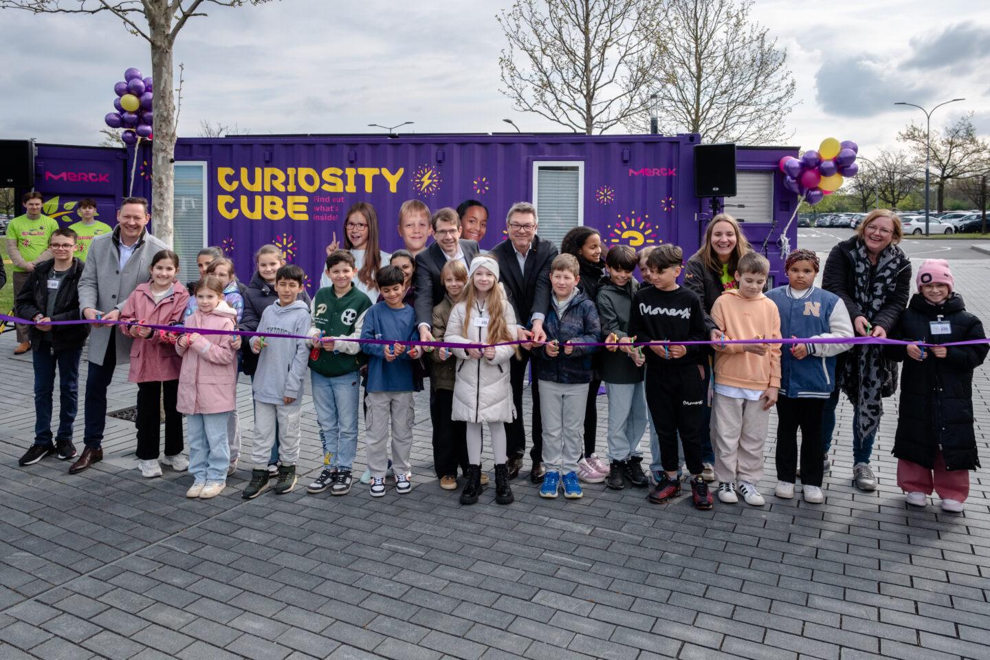 Öne çıkan görsel: Darmstadt-Arheilgen'deki Astrid Lindgren Okulu'nun üçüncü sınıf öğrencileri, Darmstadt'ta Curiosity Cube sezonunu kurdele kesme töreniyle açıyor. Ortada: Belediye Başkanı Hanno Benz (solda), Saha Müdürü Matthias Bürk (sağda) ve Proje Müdürü Stefanie Rammer (sağdan ikinci). Fotoğraf: Merck