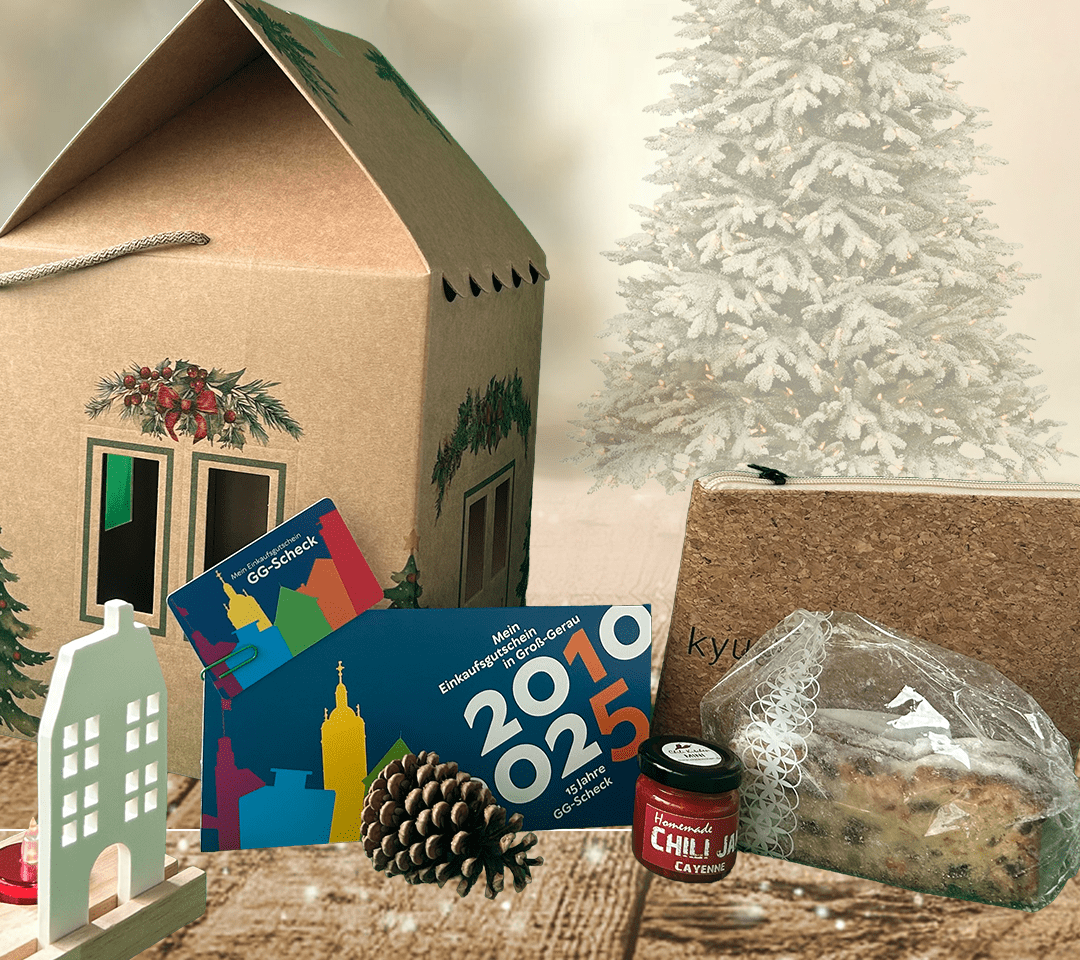 Die Weihnachtsbox enthält regionale Spezialitäten und Geschenkartikel, darunter ein Lichthaus mit LED-Teelicht, einen Christstollen der Bäckerei Darmstädter, eine Chili-Marmelade von Mike’s Chili Kitchen, eine Korktasche sowie den Stadtgutschein „GG-Scheck“. Verpackt in einer dekorativen Weihnachtsgeschenkbox eignet sich das Paket als Aufmerksamkeit für Familie, Freundinnen und Freunde, Kolleginnen und Kollegen oder für den eigenen Genuss.